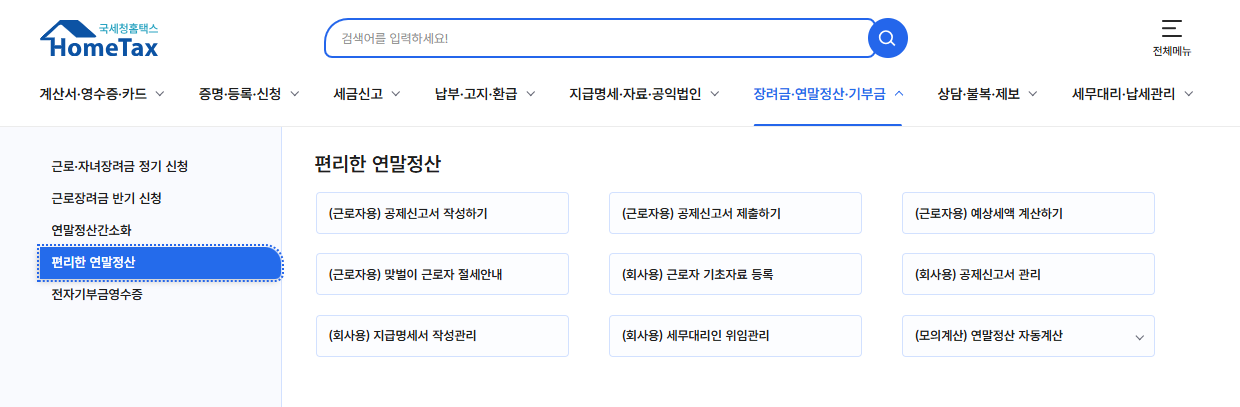 - 국세청 홈택스 접속 (https://www.hometax.go.kr) 상단 메뉴에서 "연말정산 자동계산" 클릭