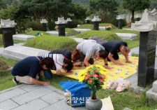 ③ 묵념 후 큰절을 합니다. 남자는 왼발, 여자는 오른발을 먼저 접으며 천천히 절을 합니다.