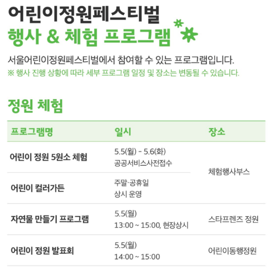 - 주요 프로그램: 26개의 어린이 맞춤형 정원 조성 (예: 유니세프 맘껏정원, 꿈틀꿈틀 정원놀이터) 생태 체험, 가드닝, 어린이 가드너 체험 마술쇼, 사물놀이 등