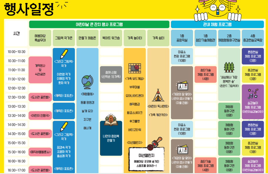 - 주요 프로그램: 책과 떠나는 신나는 모험을 주제로 한 다양한 독서 체험 스토리텔링, 만들기 체험 등